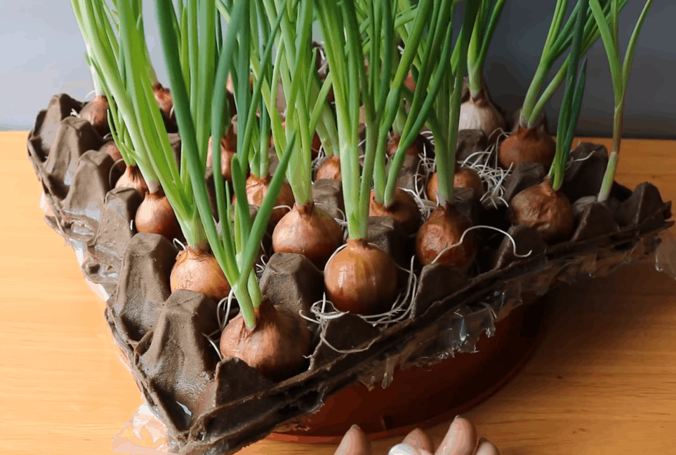 Forre uma caixa de ovos com filme plástico e prenda-o. Coloque mais algumas caixas sobre ela e deixe-as absorver muita água. Em seguida, coloque cebolinhas de tamanho adequado em cada cavidade.