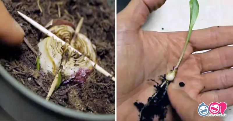 Začneme odrezaním vrchnej časti cibuľky, približne o 1/3 až 1/4 jej výšky. Potom vytvoríme zhora zárezy v tvare kríža, s hĺbkou približne 1/3 výšky cibule. Do týchto zárezov opatrne vložíme špáradlá a necháme rez uschnúť na vzduchu približne 2 dni. - Zasiatie do Pôdy: